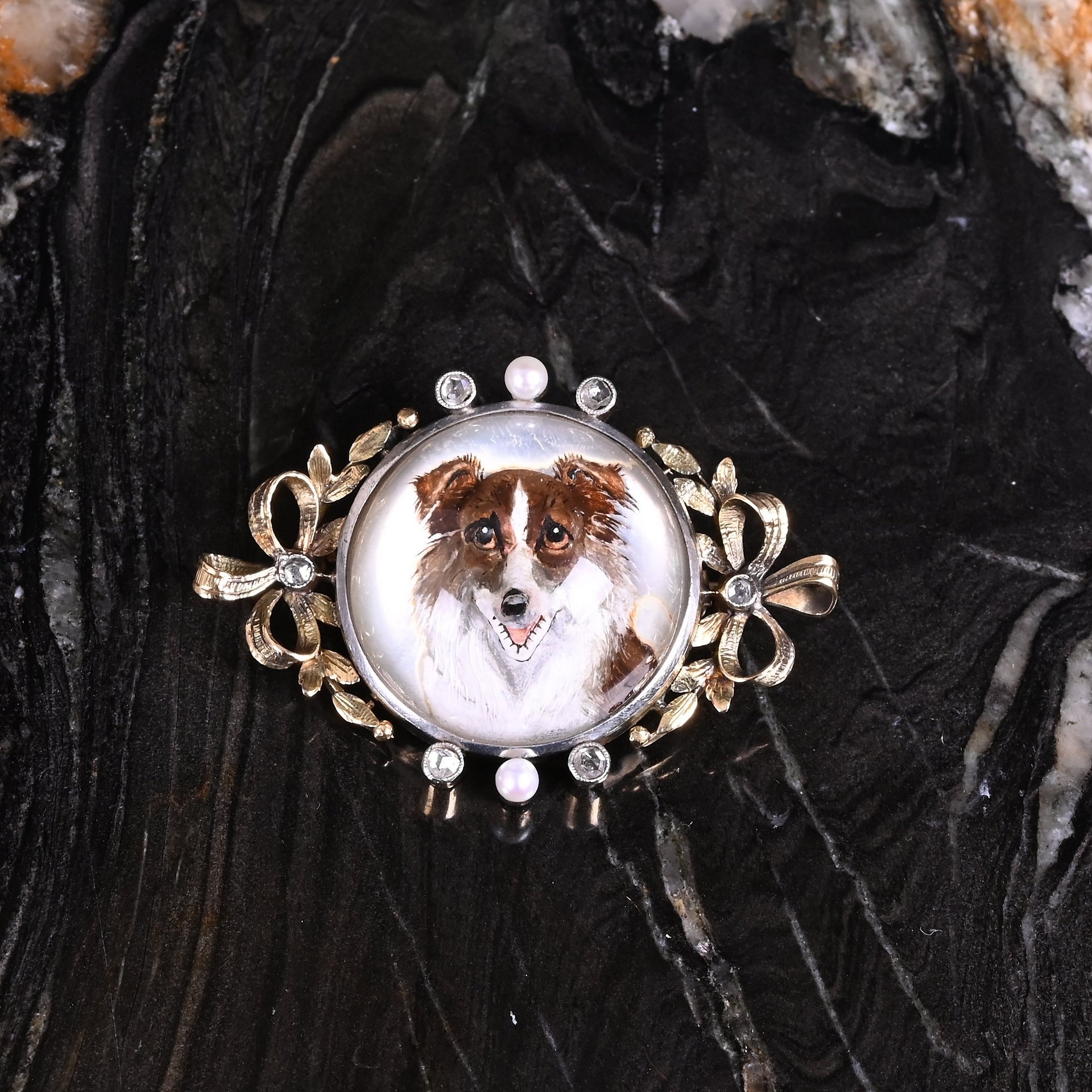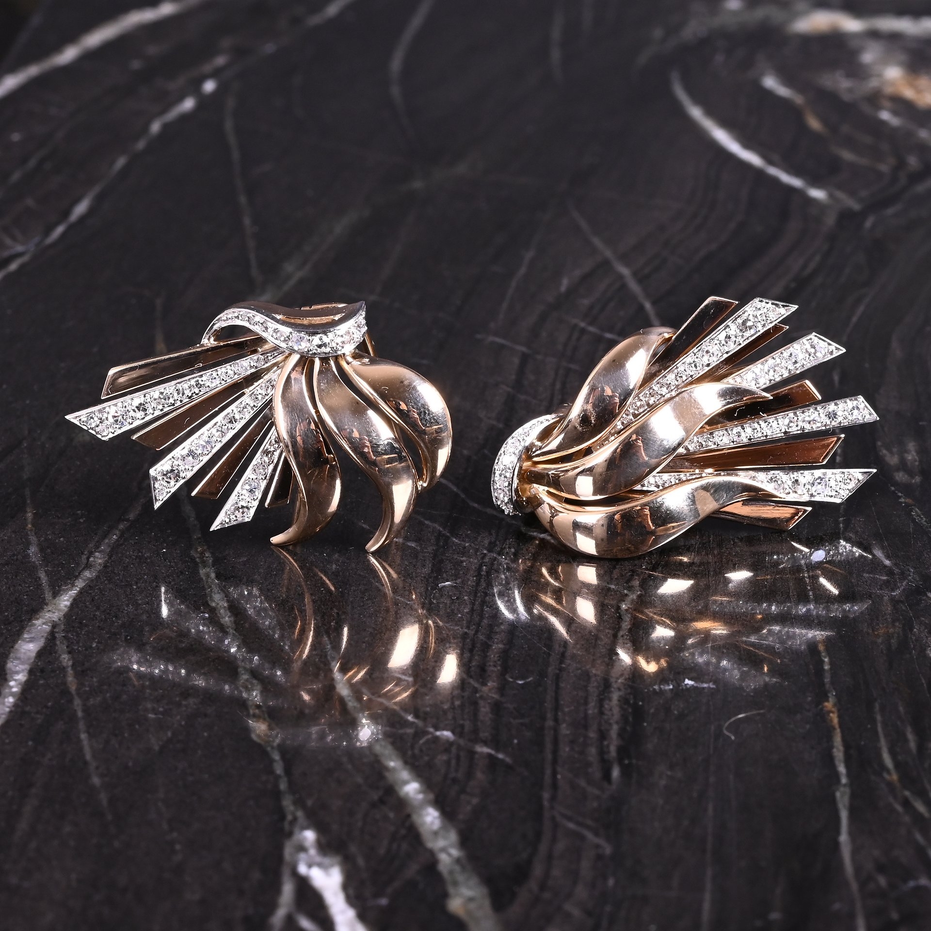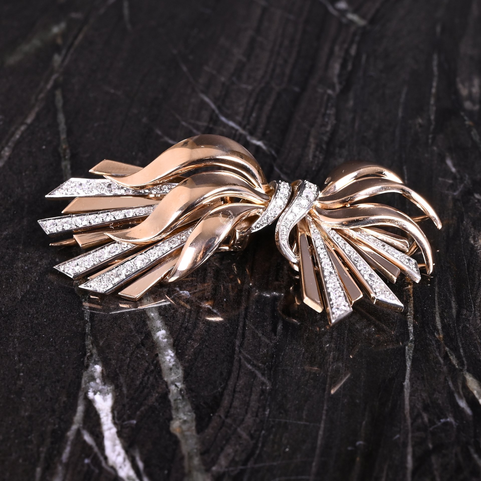 Een Retro geelgouden strikbroche met diamanten