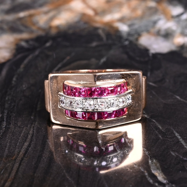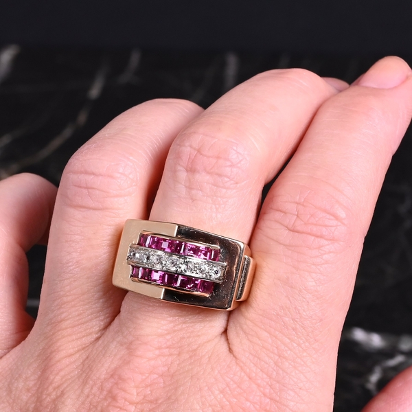 Een Retro geelgouden Tank ring met robijnen en diamanten, circa 1940