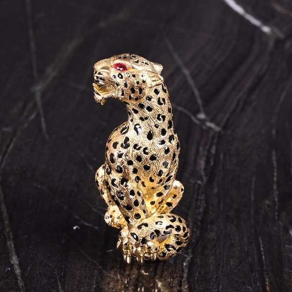 Geelgouden zittende panter met zwart emaille en robijnen oog als broche