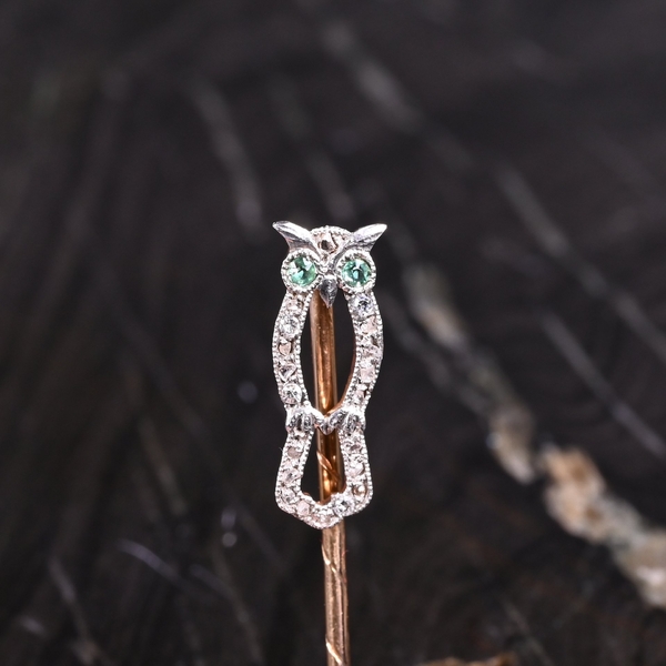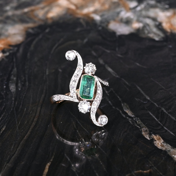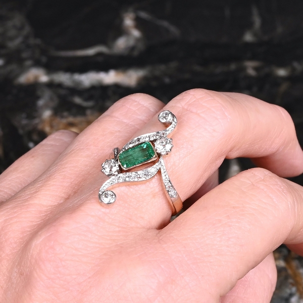 Art Nouveau geelgouden met platina ring met smaragd en diamanten