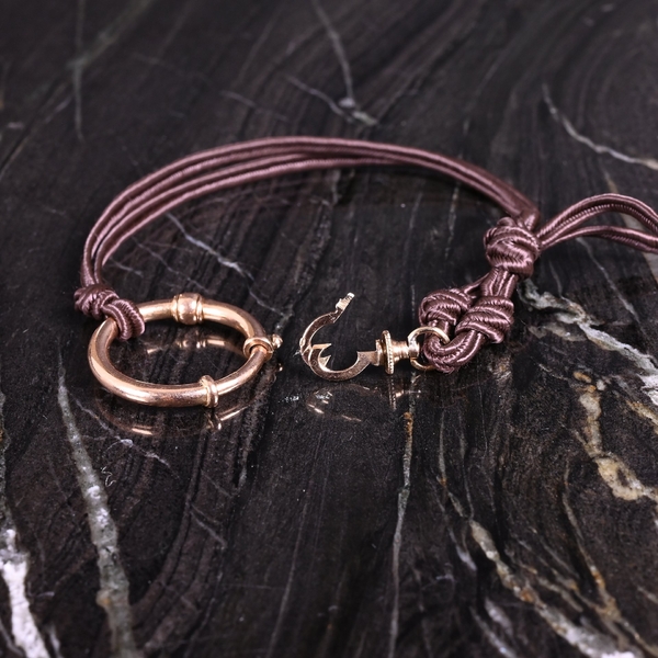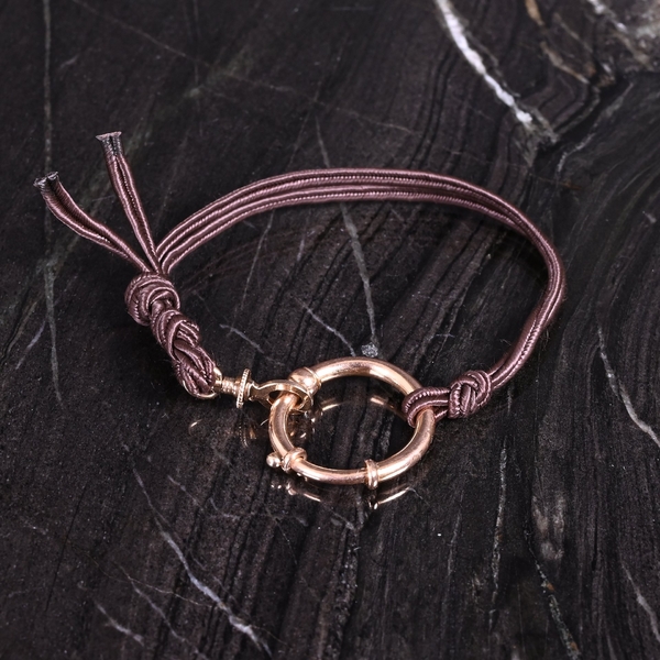 Bicolor gouden gesp met diamanten aan champagne kleurig koord als armband