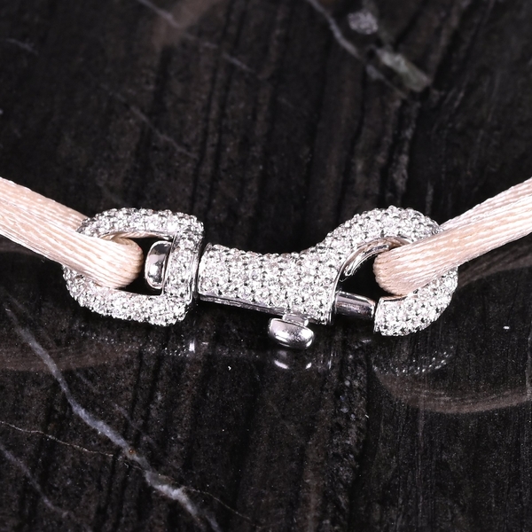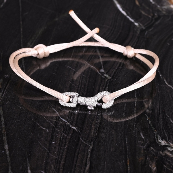 Witgouden sleutelhanger geheel bezet met diamanten aan champagne kleurig koord als armband